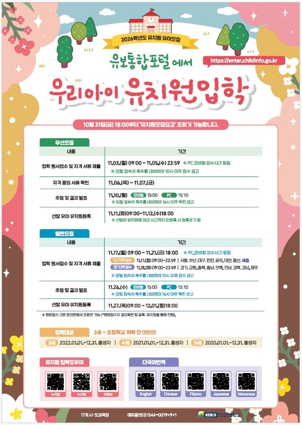 세종시교육청(교육감 권한대행 부교육감 구연희)은 유보통합포털(https://enter.childinfo.go.kr/)을 통해 2026학년도 우리아이 유치원입학을 2025년 11월 3일(월)부터 시작한다.학부모는 유치원입학 사이트 ‘유보통합포털’에서 온라인으로 유치원 입학 원서접수를 진행하며, ▲우선모집은 11월 3일(월