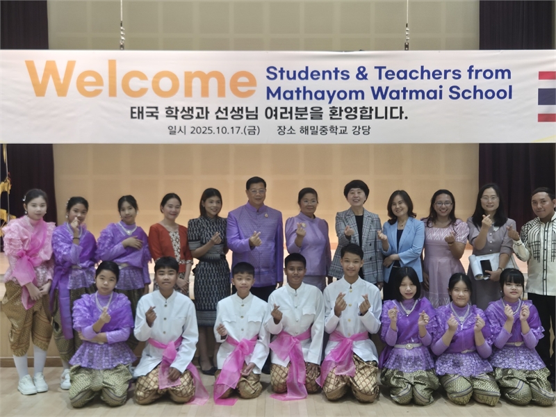 세종 해밀중학교(교장 임정진)는 10월 17일(금) 본교에서 태국 Mathayom Watmai Krongthong School 학생 및 교직원을 맞이하여 국제교류활동을 실시했다고 밝혔다.이번 교류는 학생들이 서로의 문화를 직접 체험하며 국제적 감수성과 의사소통 능력을 기를 수 있도록 기획된 대면형 프로그램으로, 그동안