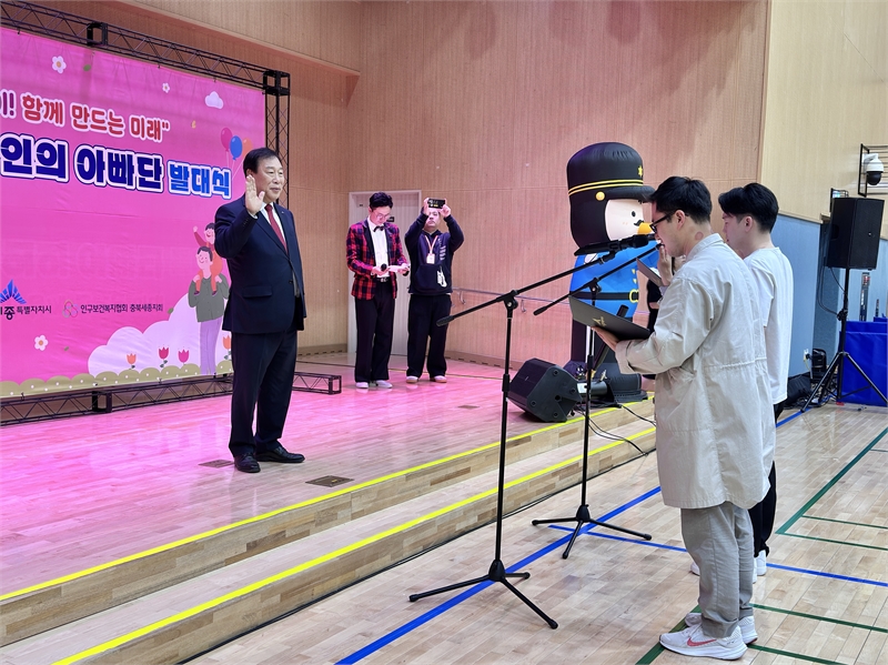 최민호 세종 시장이 '제7기 세종 100인의 아빠단' 발대식에서 선서식을 진행하고 있다.