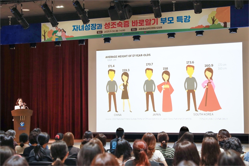 이날 특강에는 초등학생 자녀를 둔 세종시 관내 학부모 180여명이 참가했으며 김유미 센터장이 강사로 나서 소아·청소년기의 정상적인 성장 시기별 특징 및 진료가 필요한 사항, 성조숙증의 조기 발견과 진단 및 치료, 가정에서의 중요한 생활습관 관리에 대해 상세히 설명했다.