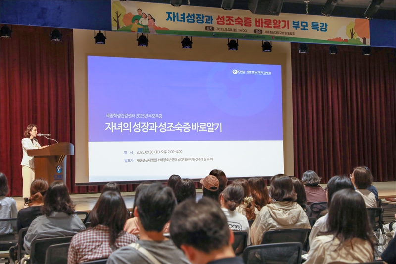 세종충남대학교병원(병원장 박재형)이 위탁 운영하는 세종학생건강센터(센터장 김유미 소아청소년과/소아내분비·유전대사분과 교수)와 세종특별자치시교육청(교육감 권한대행 부교육감 천범산)은 9월 30일(화) 세종충남대학교병원 본관 4층 도담홀에서 ‘자녀의 성장과 성조숙증 바로 알기’를 주제로 특강을 실시했다.