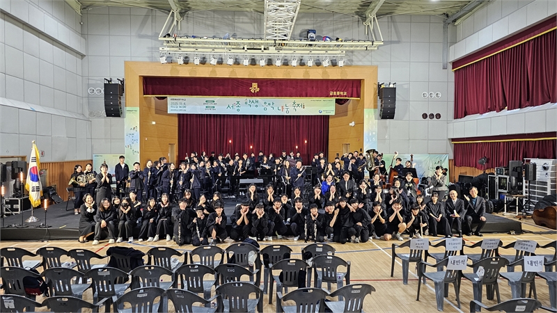 세종시교육청(교육감대행 부교육감 구연희)은 11월 4일(화)에 금호중학교 다목적강당에서 금호중학교(교장 강승연, 이하 금호중)의 ‘금호윈드오케스트라’(지도교사 조현영, 지휘자 연춘흠)와 연서중학교(교장 유효종, 이하 연서중)의 ‘연서오케스트라’(지도교사 이은정, 지휘자 김채연)가 함께 만드는 ‘2025 세종예술온(ON)학교’ 예술학교 ‘세종 학생 음악 나눔 축제(이하 나눔 축제)’를 성황리에 마쳤다고 밝혔다.