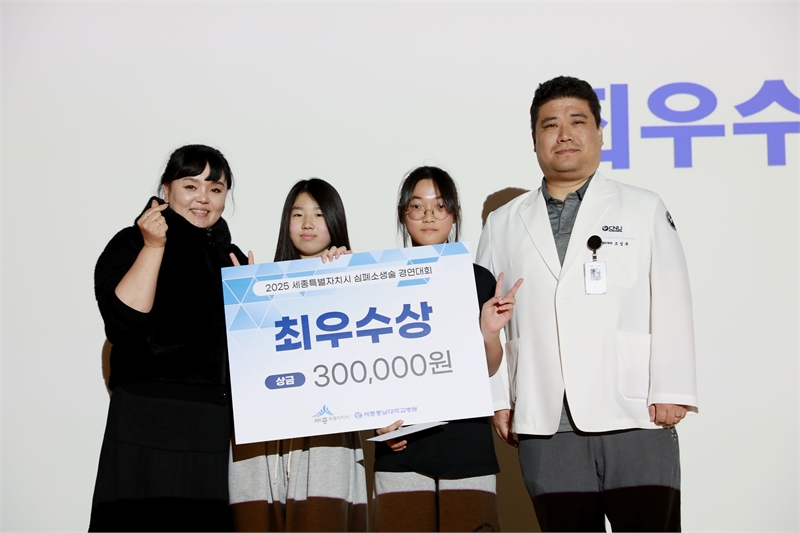 세종시가 세종충남대학교병원에서 개최한 2025년 세종시 심폐소생술 경연대회에서 최우수상 수상자들이 기념촬영을 하고 있다.