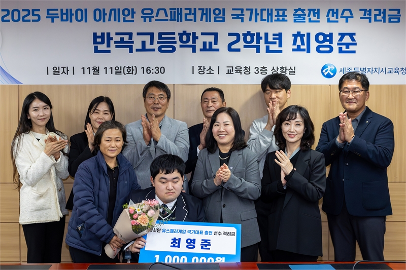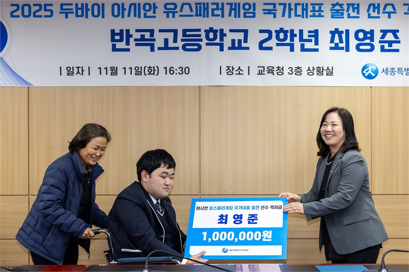 세종시교육청(교육감 권한대행 부교육감 구연희)은 반곡고등학교 2학년 최영준 학생이 12월 7일부터 14일까지 아랍에미리트 두바이에서 열리는 ‘두바이 2025 Asian Youth Para Games(아시안 유스패러게임)’ 뇌병변장애(F33) 원반던지기 종목에 국가대표로 출전함에 따라 함께 축하하고 격려하였으며, 지원금 100만 원을 전달했다고 밝혔다.