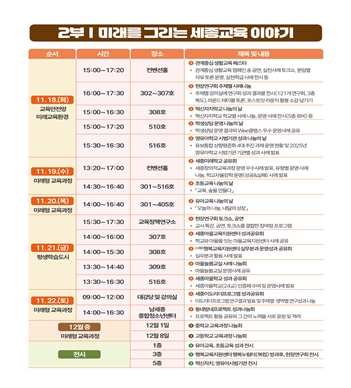 세종특별자치시교육청(교육감 권한대행 부교육감 구연희, 이하 세종교육청)은 2025년 11월 18일(화)부터 22일(토)까지 5일간 세종특별자치시교육청교육원(이하 세종교육원)에서 ‘2025학년도 세종미래교육한마당’를 개최한다고 밝혔다.