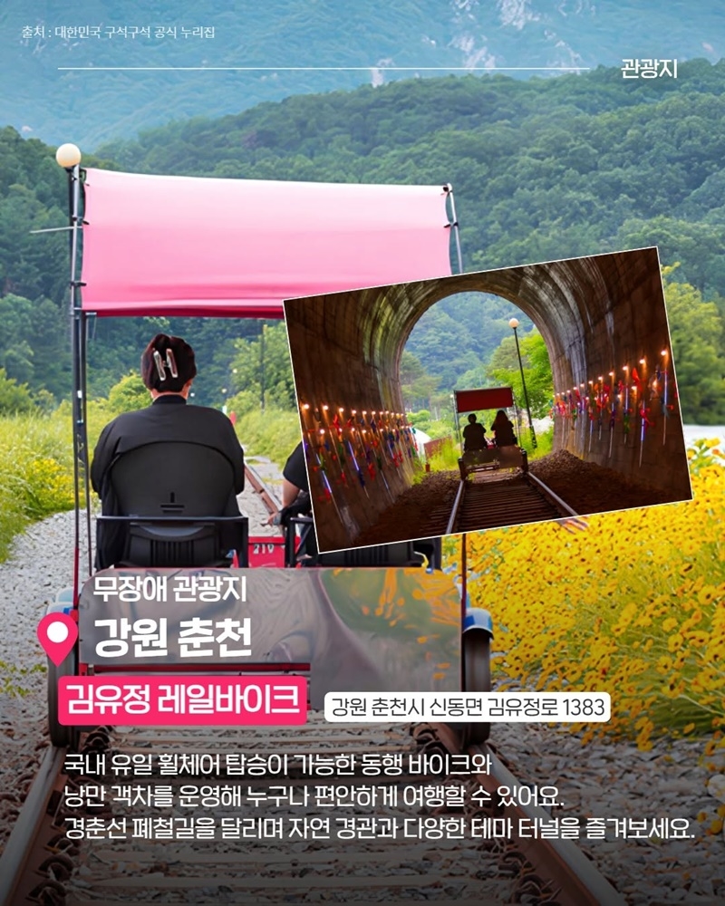 국내 유일 휠체어 탑승이 가능한 동행 바이크와 낭만 객차를 운영해 누구나 편안하게 여행할 수 있어요.