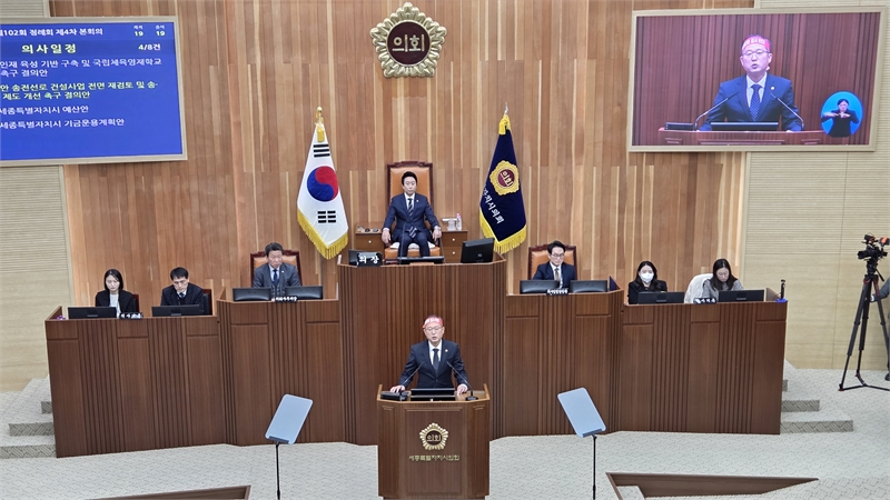 오늘 열린 정례회에서는 최원석, 홍나영, 김재형, 안신일, 유인호, 김현미 의원의 5분 자유발언과 김현옥 의원의 '세종시 교육청 잔식(예비식) 기부 활성화 관련 집행부 및 교육청 대응방안에 관한 긴급현안질문' 및 시와 교육청의 2026년도 예산안 및 기금운용계획안 등 을 처리했다.
