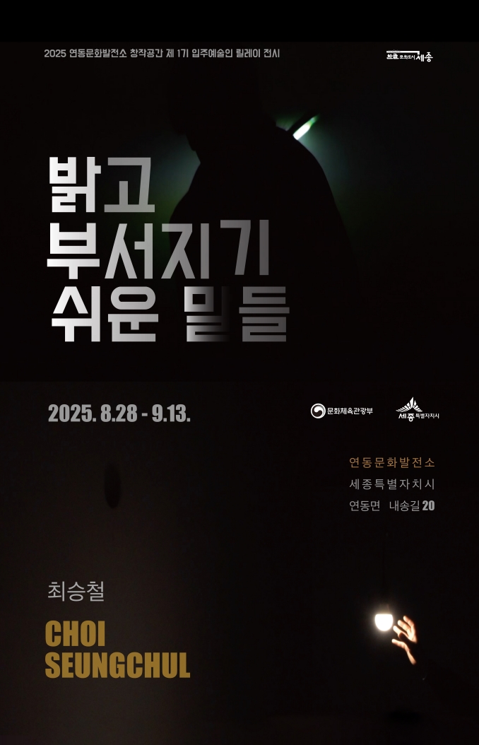 세종시(시장 최민호)가 28일부터 내달 13일까지 연동문화발전소에서 제1기 입주예술인의 세 번째 이어가는 전시로 최승철 작가의 ‘밝고 부서지기 쉬운 말들’을 개최한다.이번 전시는 작가 개인의 기억을 행위와 사건으로 변환하고, 다시 언어로 재구성하는 과정을 탐구한다. 이를 통해 신체의 호흡부터 충돌의 흔적 등 작업 중 발