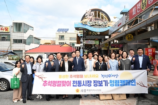 세종시의회(의장 임채성)는 29일 관내 세종전통시장(조치원)과 대평시장에서 의원과 의회사무처 직원 40여명이 함께하는 추석맞이 전통시장 장보기 행사를 추진하는 한편, 공직사회 청렴 문화 확산을 위한 캠페인도 함께 전개했다.