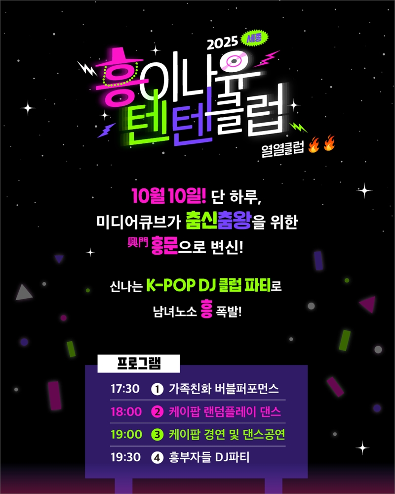 세종시(시장 최민호)는 오는 10일 오후 5시 30분부터 9시까지 나성동 도시상징광장 일원에서 세종시문화관광재단과 함께 ‘2025 세종 흥이나유 텐텐클럽’을 개최한다.