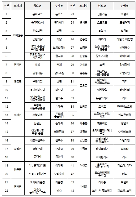 평가는 전문가의 서면평가와 현장평가를 통해 엄정하게 진행됐으며, 맛‧시설‧서비스‧지역 고유성 등 요건을 종합적으로 평가해 한식·양식·카페 등 다양한 분야의 음식점 44곳이 최종 선정됐다.