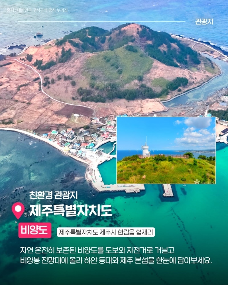자연 온전히 보존된 비양도를 도보와 자전거로 거닐고 비양봉 전망대에 올라 하얀 등대와 제주 본섬을 한눈에 담아보세요.