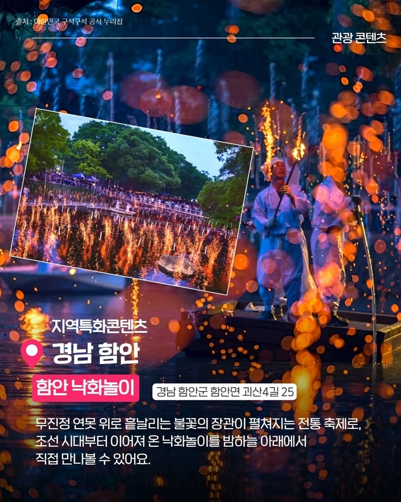 무진정 연못 위로 흩날리는 불꽃의 장관이 펼쳐지는 전통 축제로, 조선 시대부터 이어져 온 낙화놀이를 밤하늘 아래에서 직접 만나볼 수 있어요.