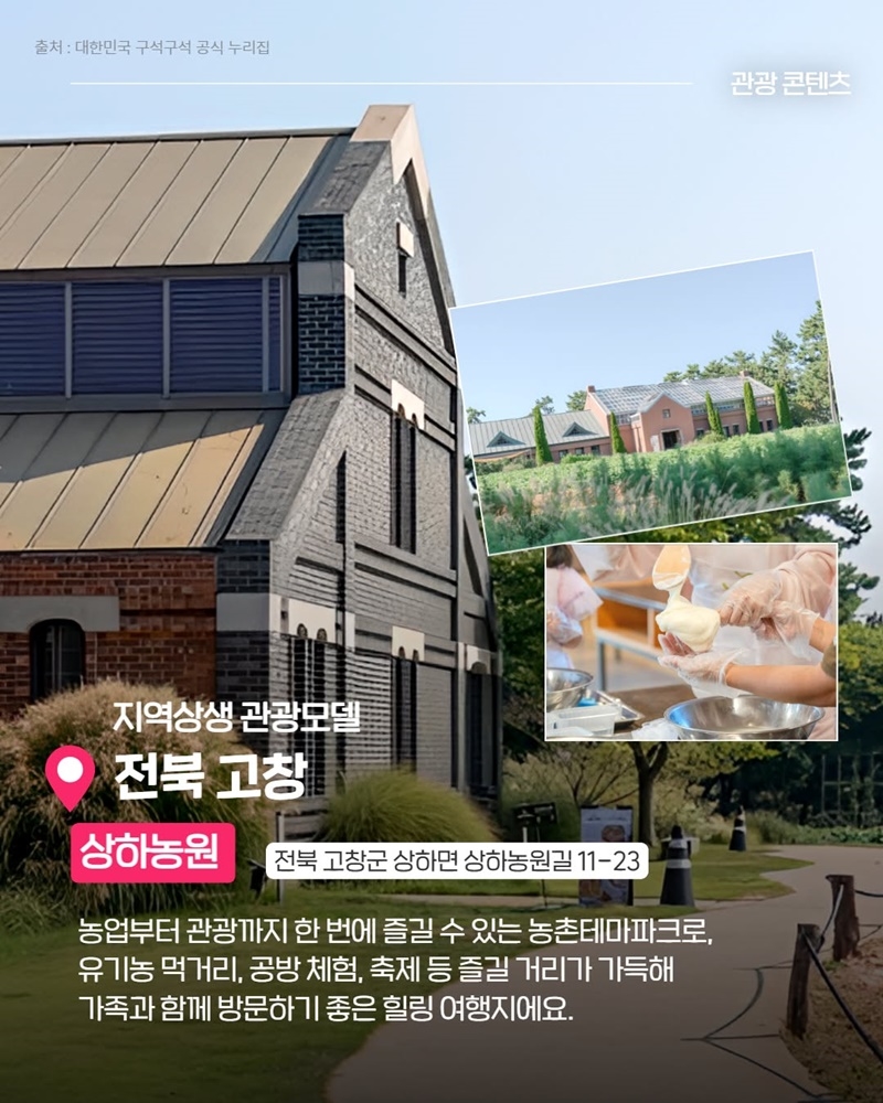 농업부터 관광까지 한 번에 즐길 수 있는 농촌테마파크로, 유기농 먹거리, 공방체험, 축제 등 즐길거리가 가득해 가족과 함께 방문하기 좋은 힐링 여행지에요.