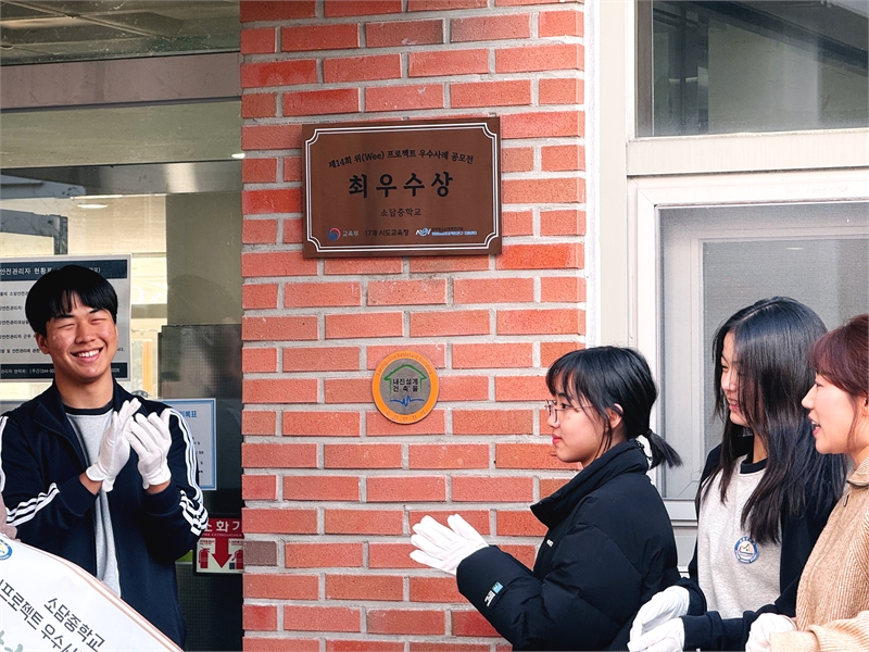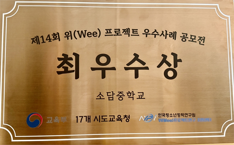 세종시 소담중학교(교장 박현미, 이하 소담중)가 제14회 Wee 프로젝트 우수사례 공모전에서 ‘전국 최우수교(한국청소년정책연구원장상)’로 선정돼 기관 표창을 받아 12월 9일(화) 교내에서 교직원 및 학생회 임원들이 함께한 가운데 최우수교 현판식을 개최했다고 밝혔다.